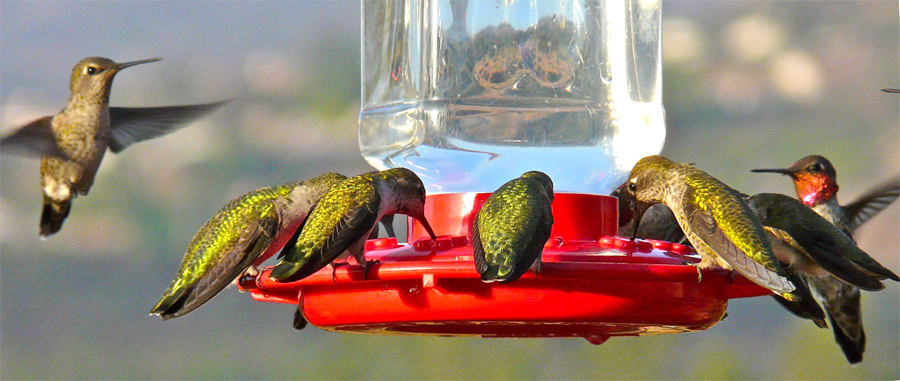 When I got up the next morning I immediately noticed the racket coming from outside. Upon stepping out onto the back patio, I was stunned by the barrage of loud and clearly angry vocalizations coming from what seemed like every direction. Short shrieking trills and chirps, twittery sharp chits accompanied by the buzzing and whirring of wings. I was overwhelmed by one "close encounter" after the next as they proceeded to dive and dart all around me. A few very brave (or just very upset) birds had the gall to get right up in my face demanding to know where the hell their feeders had gone.